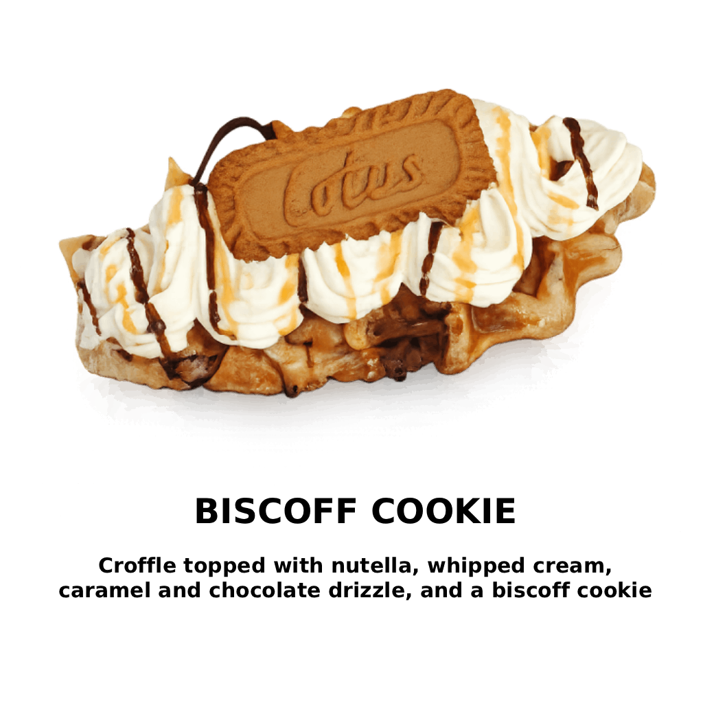 Crome topped with nutella, whipped cream, caramel and chocolate drizzle, and a biscoff cookie